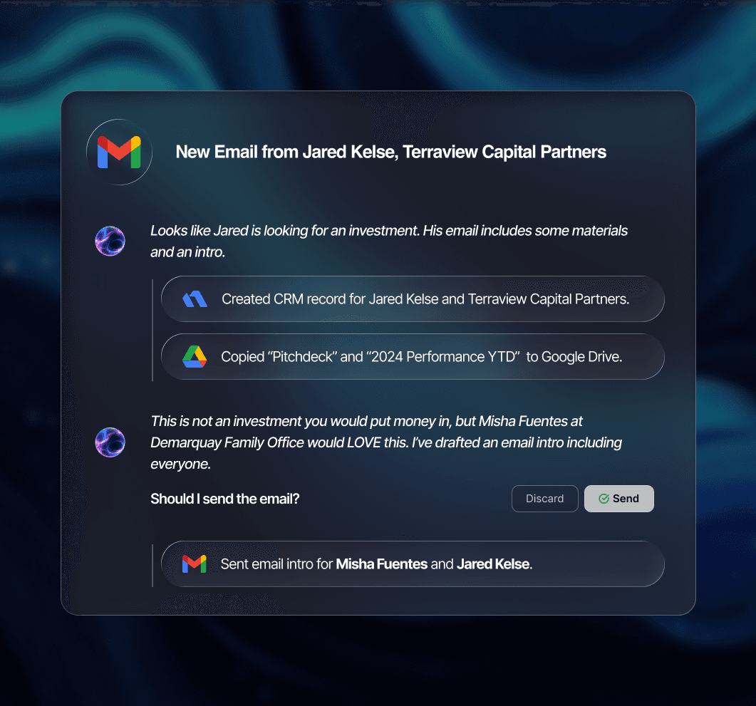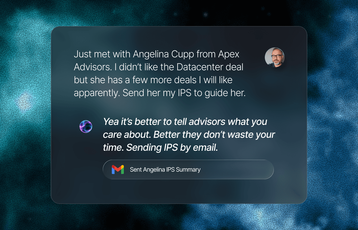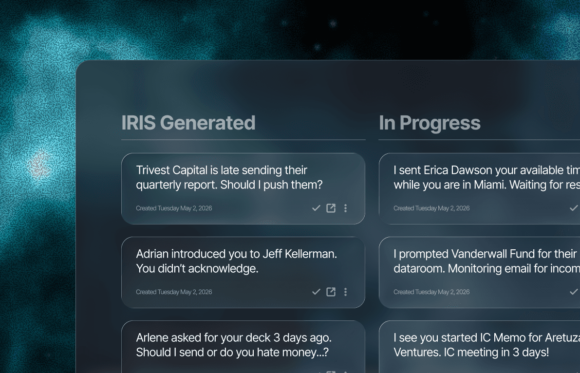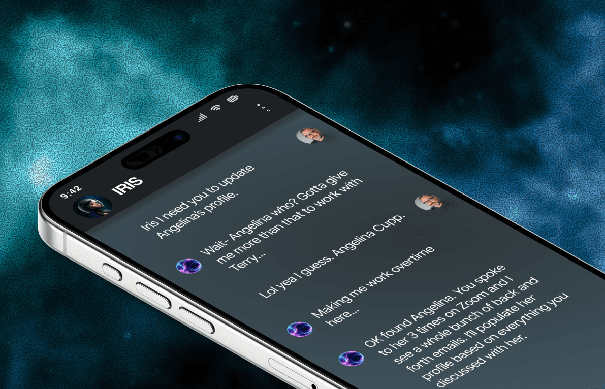Your deals live in emails. Your relationships live in memory. Your files live in folders nobody opens. IRIS aggregates your data from their silos, and auto populates your CRM so you aren’t at the mercy of your team’s diligence.