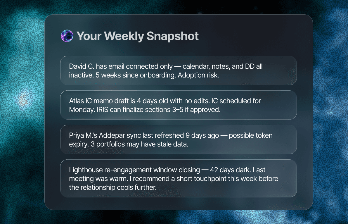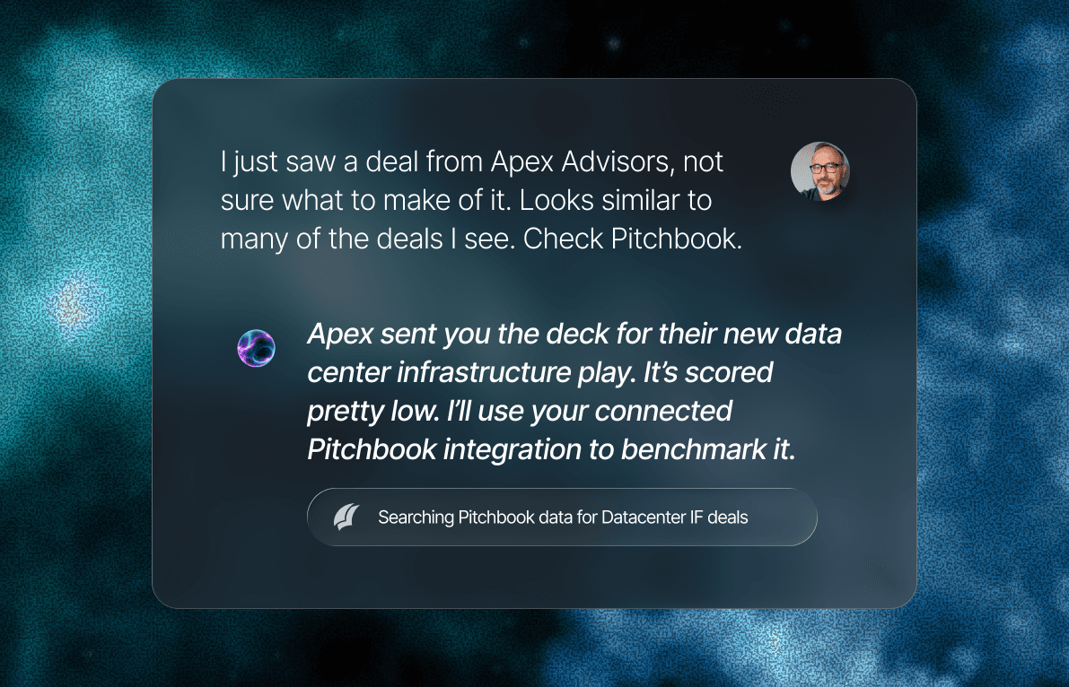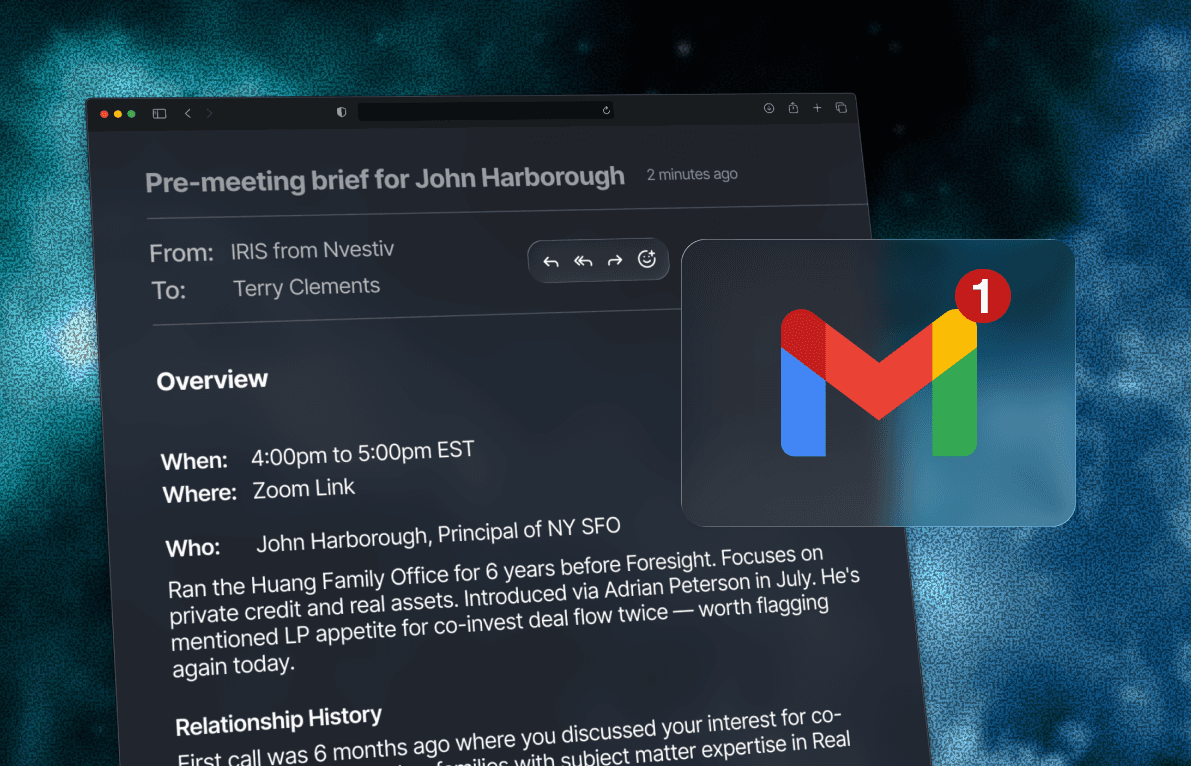 Nvestiv is an AI operating system for private investment firms. It connects to your entire tech stack — email, files, meetings, investment tools — and builds a living intelligence layer from everything your firm knows. IRIS is the AI interface that sits on top, letting you ask questions, run workflows, and execute work across all your systems through conversation.